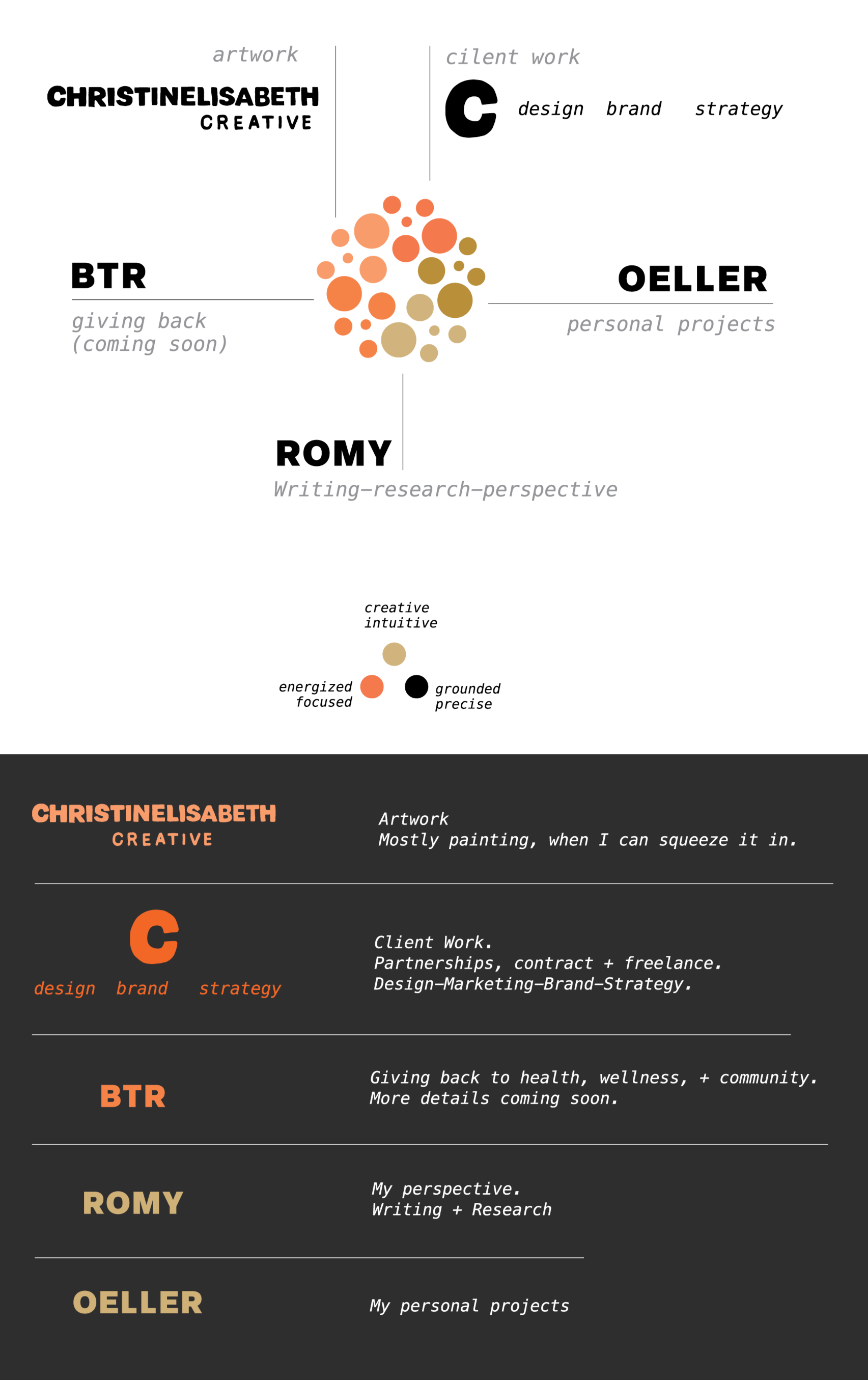 The different areas of my work represent this mix between creative + analytical:ONE / design, branding, & strategy for clientsTWO / artworkTHREE / personal design + innovation projects that allow me to experimentFOUR / writing, which has been a new and deeply personal outletFIVE / a way of giving back to the groups and causes that I’m passionate aboutIf this sounds intriguing, I’d love to connect!